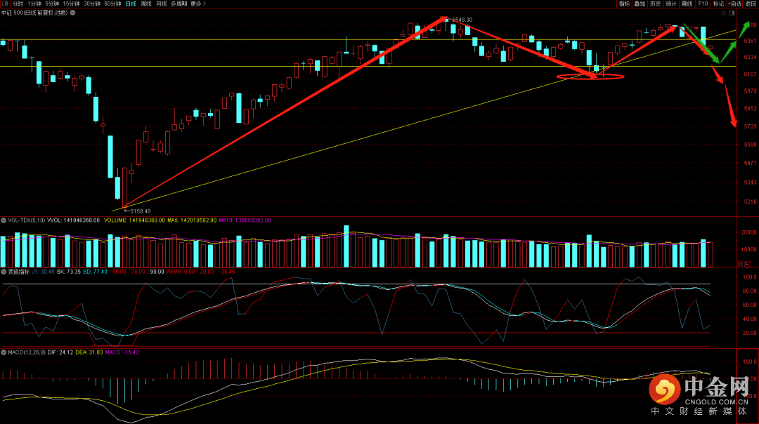 中证500出现日线双顶结构,后续关注是否会跌破6080,如果没有跌破还会有再次上行的动能,一旦跌破将可能出现震荡下行的下跌趋势。