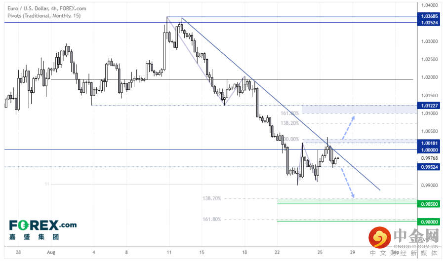 欧元/美元的走势一直没有摆脱斐波纳契回档位、趋势线阻力和平价位的桎梏。目前大家的焦点都在鲍威尔讲话上,其可以轻松确立或改变美元的走向,继而影响欧元走势。我预计价格在平价位附近会有很多的“噪音”,但如果可以下破0.9950,合理推测有机会延续跌势并确认周五的锤子形态高点属于修正行情的末端。价格已多次假性上破平价,所以我们选择在站上本周高点后再假设延续涨势。