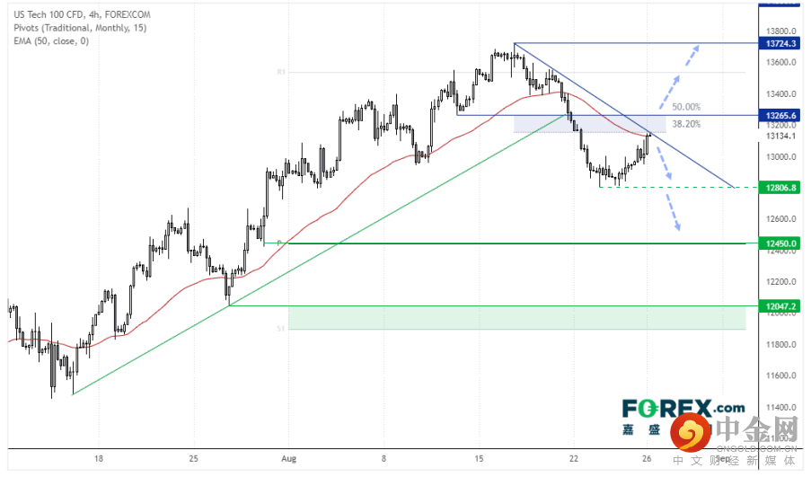 该股指延续昨天逆势反弹的势头并测试了趋势线阻力,其恰好也是38.2%回档位。所以,价格可能先下跌再决定接下来的方向。如果我们看到在当前价构筑波段高点的确实证据,可能吸引看跌波段交易者,第一步下看12,806。如果下破该位,可能重点关注12,450支撑区域。如果站上13,265,我们可能转为看涨。