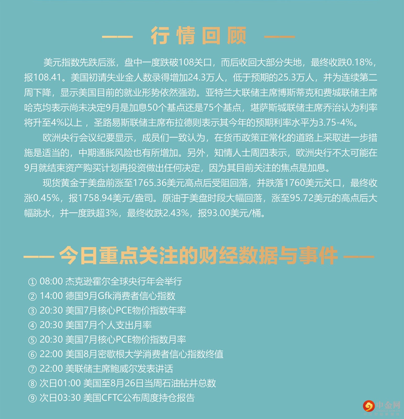 美元指数先跌后涨,盘中一度跌破108关口,而后收回大部分失地,最终收跌0.18%,报108.41。美国初请失业金人数录得增加24.3万人,低于预期的25.3万人,并为连续第二周下降,显示美国目前的就业形势依然强劲。亚特兰大联储主席博斯蒂克和费城联储主席哈克均表示尚未决定9月是加息50个基点还是75个基点,堪萨斯城联储主席乔治认为利率将升至4%以上 ,圣路易斯联储主席布拉德则表示其今年的预期利率水平为3.75-4%。 欧洲央行会议纪要显示,成员们一致认为,在货币政策正常化的道路上采取进一步措施是适当的,中期通胀风险也有所增加。另外,知情人士周四表示,欧洲央行不太可能在9月就结束资产购买计划再投资做出任何决定,因为其目前关注的焦点是加息。 现货黄金于美盘前涨至1765.36美元高点后受阻回落,并跌落1760美元关口,最终收涨0.45%,报1758.94美元/盎司。原油于美盘时段大幅回落,涨至95.72美元的高点后大幅跳水,并一度跌超3%,最终收跌2.43%,报93.00美元/桶。