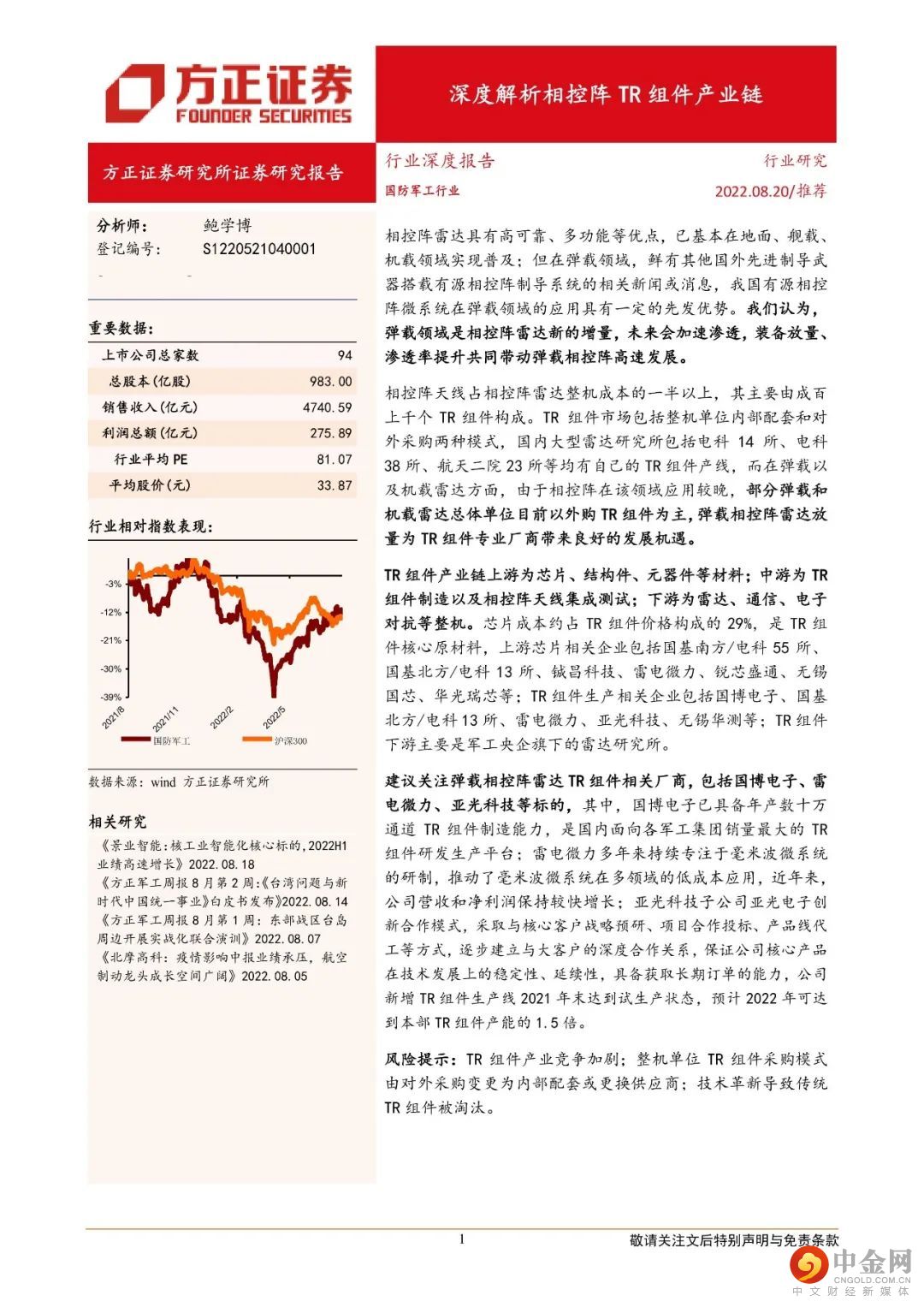 本文来自方正证券研究所于2022年8月22日发布的报告《深度解析相控阵TR组件产业链》,欲了解具体内容,请阅读报告原文。