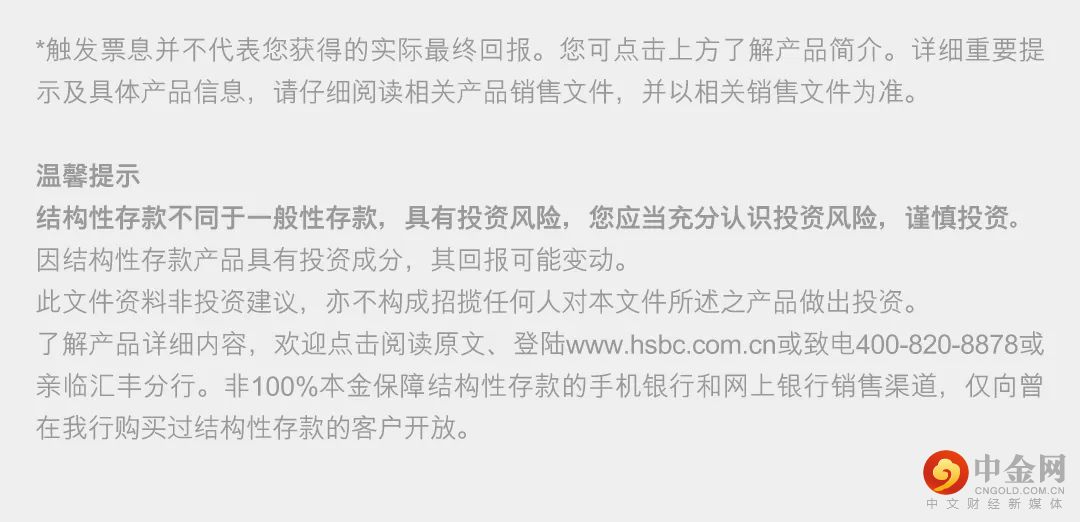 触发票息:该预定值由银行根据销售期前的市场状况而设定,仅供参考。触发票息为您在持有本结构性存款产品至到期并且触发事件发生的情况下就整个投资期可获得的票息。