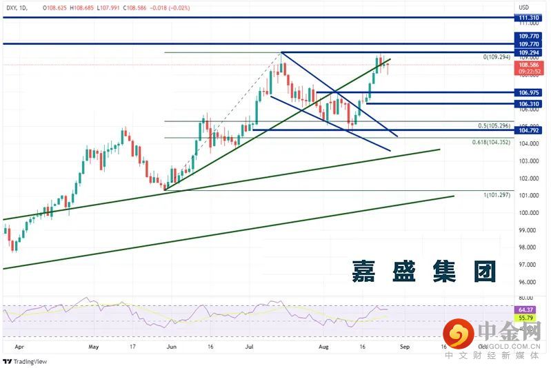 美元指数自从4月14日站上上升通道100.00附近以来大举冲高,5月30日回踩了趋势线后在7月14日摸至20年高点109.29。之后,价格回撤并形成下降楔形,最低跌至水平支撑位,就在5月30日低点到7月14日高点行情的50%回档位下方不远处的104.65。两天后,美元指数打破106附近的下降趋势线且自此再未回头。价格在周二测试了7月14日高点并守于其下,一直交投于近期水平附近,等待鲍威尔讲话。