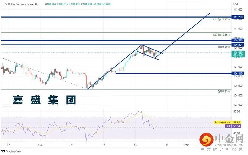 美元指数4小时图上近期上涨后于前高点下方进入盘整,可能形成旗形形态。如果价格确实打破前述形态,目标指向突破位加上旗杆长度,本例中在112.60附近。但在那之前还有前高点109.29、2002年9月以来高点形成的水平阻力位109.77以及7月14日高点到8月10日低点行情的127.2%扩展位110.56这些阻力。如果受制于阻力,下档支撑位先后有旗形下轨趋势线107.99附近、8月16日低点106.31和8月10日低点104.64。
