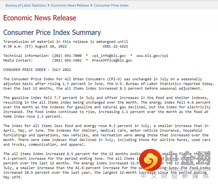 在美国劳工统计局(BLS)公布的数据中,我们可以看到7月通胀率已经从6月的9.1%回落至8.5%,并且低于市场预期的8.7%。
