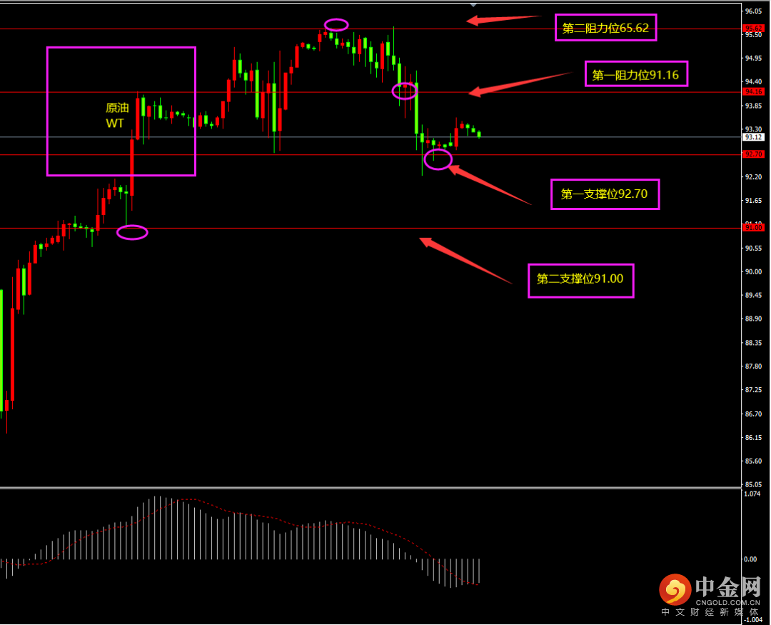 原油昨日收阴线,价格有所回落,空头有所增强,但底部连续上涨,多头仍在,且MACD逐渐上移,空头对应减弱,日内更多以偏震荡为主。小时图原油自顶背离之后,期间有大阴线回落,空头增强,但MACD能量并未大幅走弱,多头仍在,且越往下行,支撑越强,日内更多以偏震荡为主?