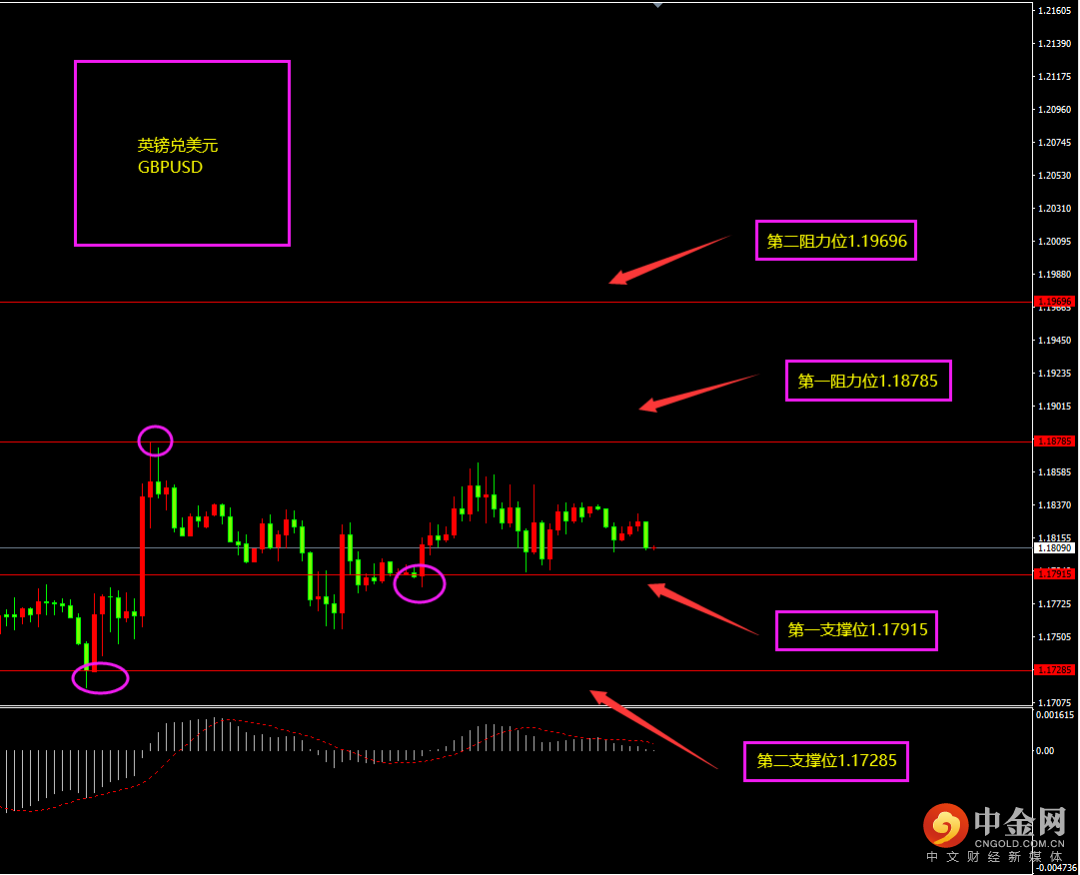 天图欧元收小阳线,上影线较长,价格曾一度冲高之后有所回落,因晚间美国数据打压所致,短期底背离形态未破,多头仍在,日内更多以逢低看多为主?小时图欧元期间有连续阴线回落,MACD虽位于0轴之下,但能量并未大幅增强,空头较弱,短期底部震荡低位未破,支撑仍在,日内更多以逢低看多为主?