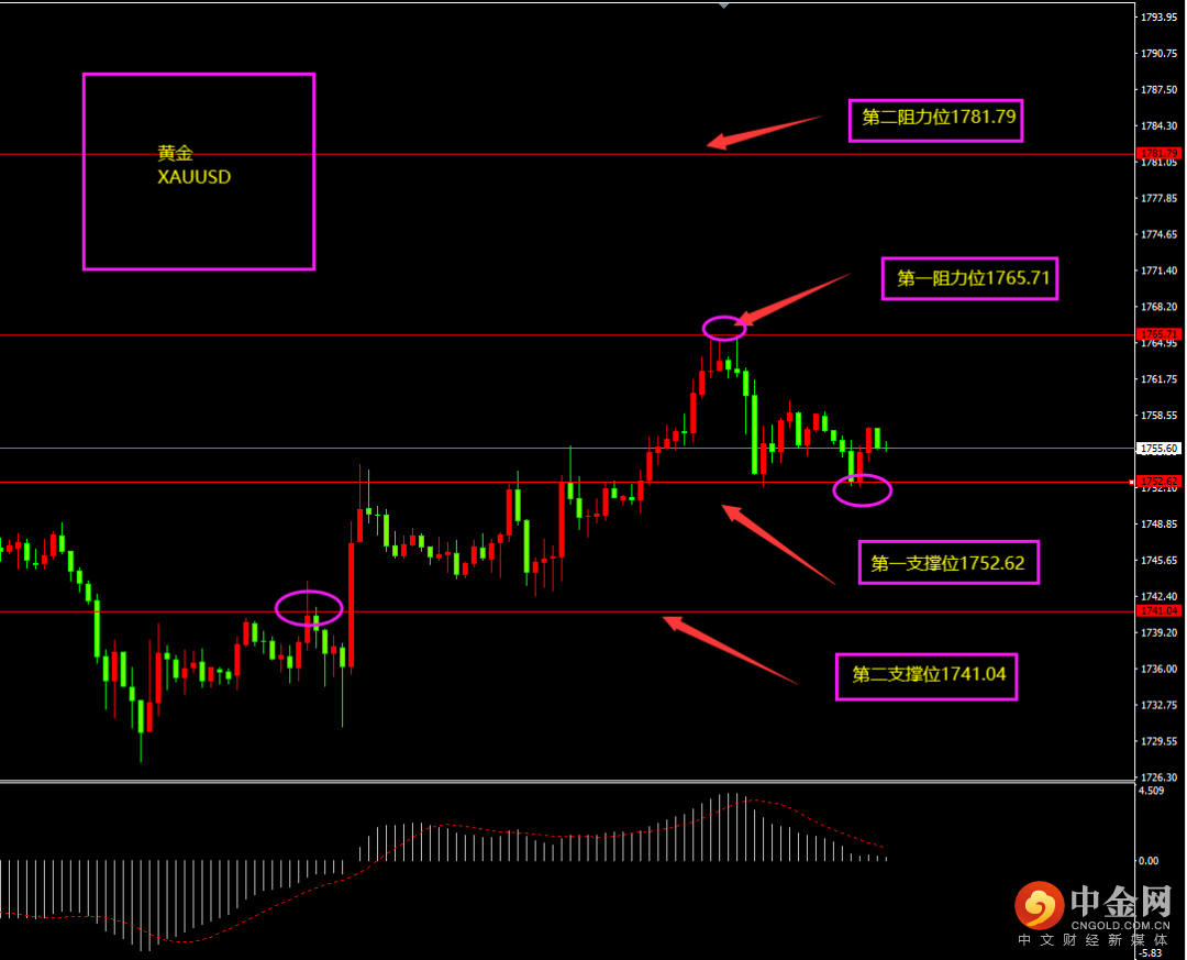 天图黄金收阳线,价格有所冲高,多头有所增强,但3连阳力度不强,短期MACD位于0轴附近,多空仍低位博弈,日内更多试探性以逢低看多为主。小时图黄金期间连续阴线回落,空头增强,MACD位于0轴附近,多空低位博弈,短期底部有部分阳线维稳,多头增强,日内更多以逢低看多为主?(仍有下滑可能)