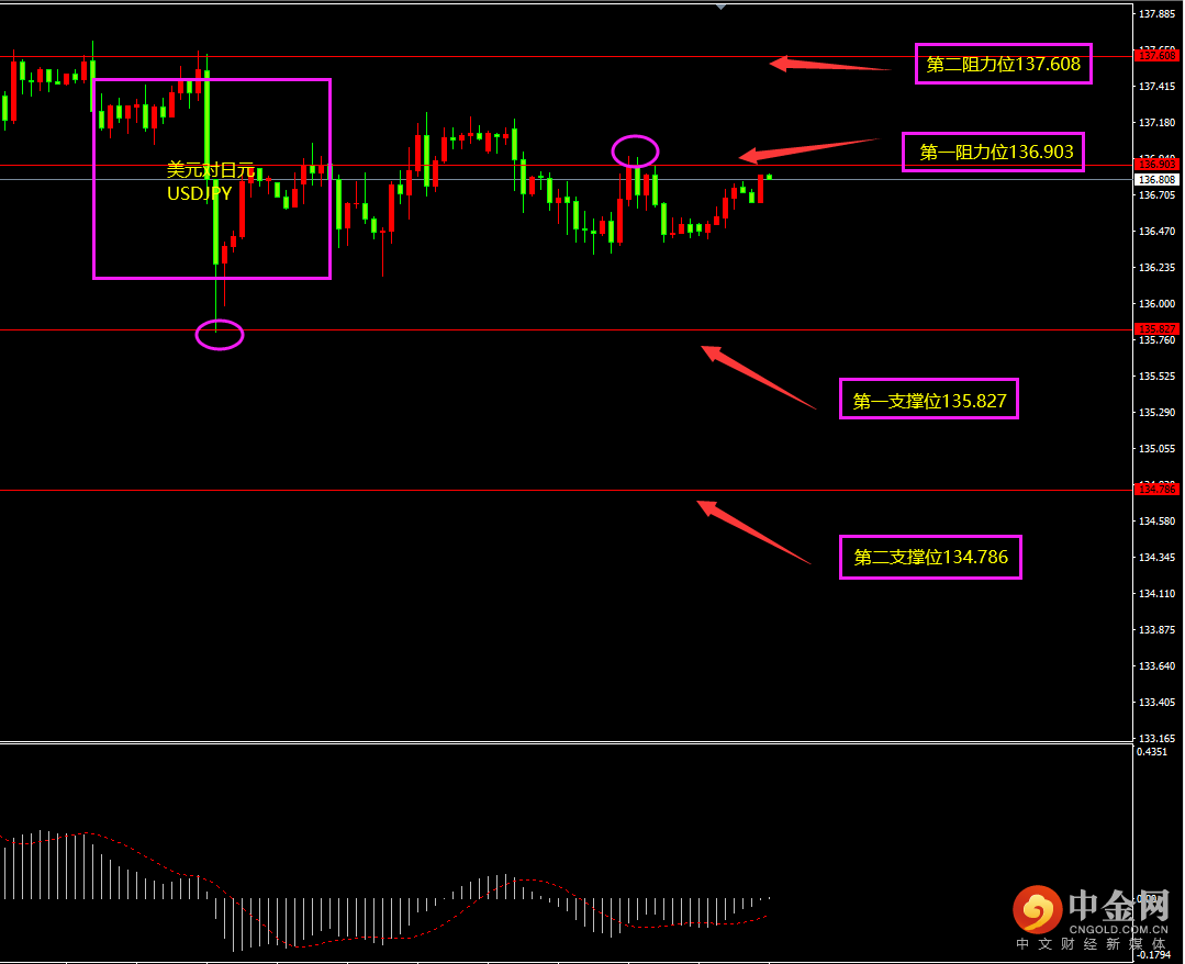 天图美日收阴线,价格有所回落,空头有所增强,短期MACD虽位于0轴之上,但能量较小,多头不强,且价格未破前高,阻力仍在,日内更多以逢高看空为主。小时图美日期间期间连续阴线下滑,MACD位于0轴之下,空头占优,短期底部有部分阳线维稳,多头仍在,日内更多以震荡带有一丝下行为主?