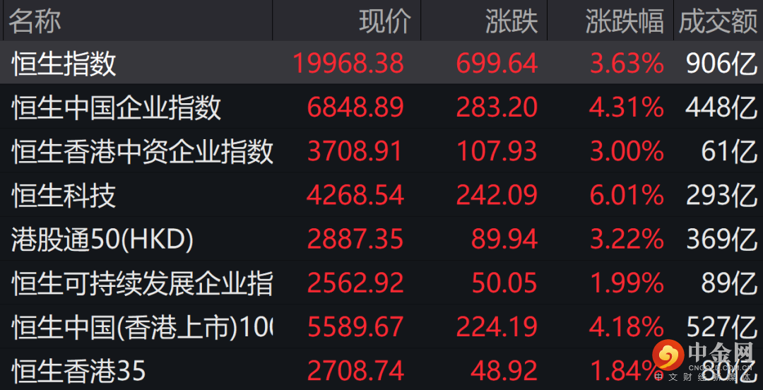 港股方面,恒生指数收盘涨3.63%,恒生科技指数涨6.01%;科技股大涨,京东集团涨约11%,哔哩哔哩涨约10%,百度集团涨约9%,阿里巴巴涨约9%。
