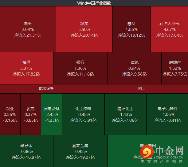 行业板块中,煤炭、石油天然气、海运等传统行业涨幅居前,电工电网、半导体、元器件等前期热门内容领跌。