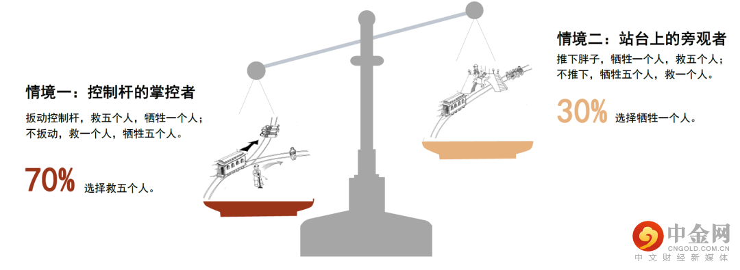 除此以外,智能合约的建立意味着道德选择的确定性,但不同情境和不同背景下人的道德选择却可能很不同。举例来说,在电车难题中,同样是牺牲1人来拯救5人,拉下控制杆就比亲手推下大胖子要容易被接受得多(见下图)。高度依赖于情境和背景知识的道德选择暗示我们:可能不存在一种合约性质的道德规则,能够让人遵循这种规则而总是做出正确的道德选择。