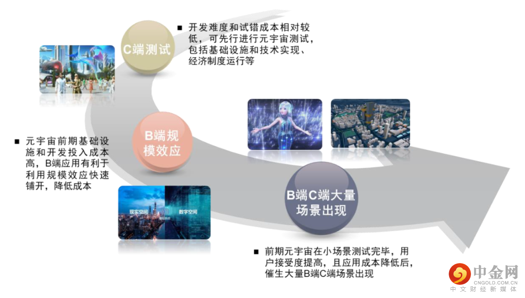 基于以上洞察,我们提出元宇宙的发展路径。首先,打造元宇宙技术维度的底层地基,搭建元宇宙所需的通信、计算机软硬件等基础设施并测试部分场景;在此基础上,编织元宇宙在经济与社会治理维度的参与基础,通过区块链、NFT等加密学技术落实去中心化的思想,构建元宇宙的经济/治理系统;在基础设施和经济体系搭建完善下迎来应用场景大爆发,真正实现元宇宙。在这一建设过程中,我们相信和过去的许多科技周期一样,软硬件的发展将相辅相成,共同推动元宇宙世界的发展螺旋上升。在场景落地顺序上,我们认为元宇宙会率先在C端场景测试,进一步推动B端场景产生规模化经济效应,最后往B端、C端更多场景大规模扩张。