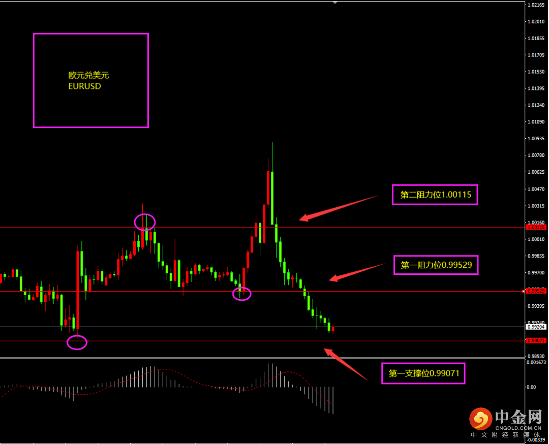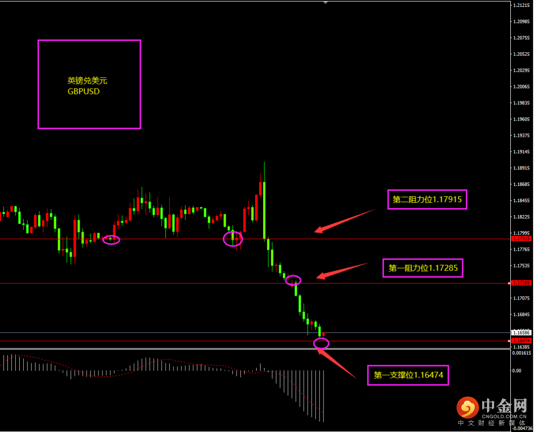 天图欧元收小阴线,上影线较长,价格一度冲高之后有所回落,多头遭受空头打压,短期底背离虽未破,但多头较弱而空头转强,日内更多以逢高看空为主。小时图欧元期间有连续阴线回落,MACD位于0轴之下,空头占优,短期底部无大阳线筑底,多头不强,日内更多以逢高看空为主。(大阳线不出,多单不入)
