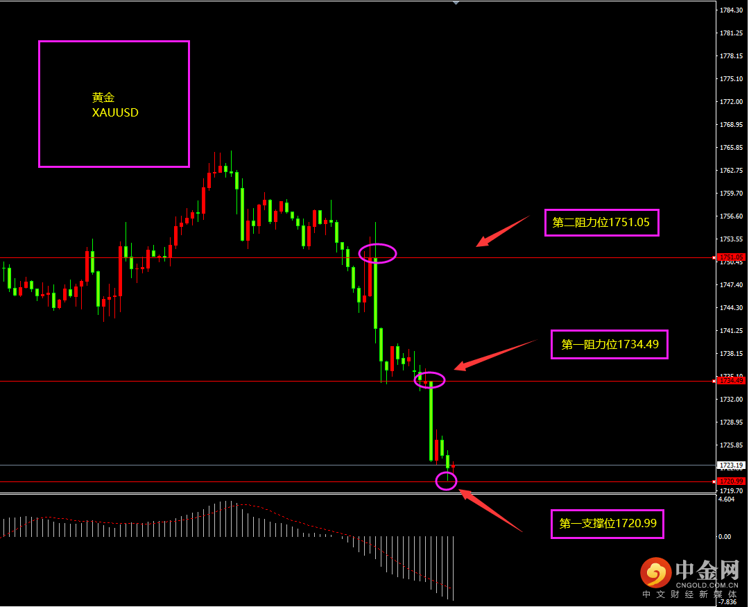 天图黄金收大阴线,价格大幅回落,空头有所增强,短期3连阳力度较弱,多头不强,近期将进入深度调整,日内更多以逢高看空为主。小时图黄金期间连续阴线回落,MACD位于0轴之下,空头占优,短期底部无大阳线筑底,多头不强,日内更多以逢高看空为主。(大阳线不出,多单不入)