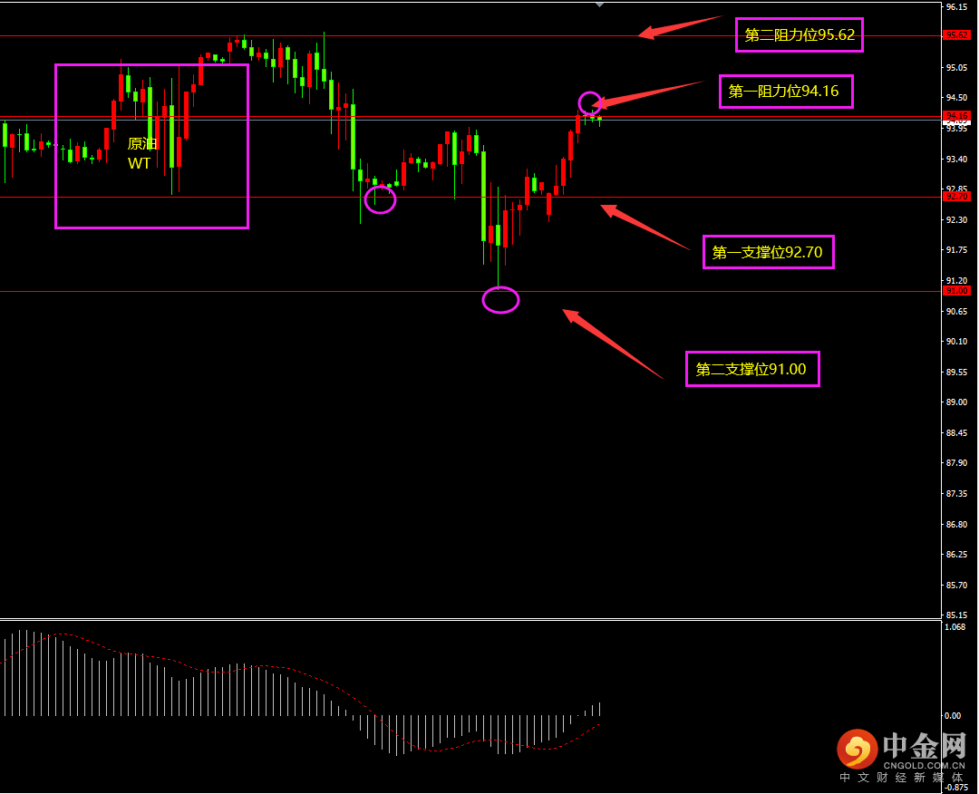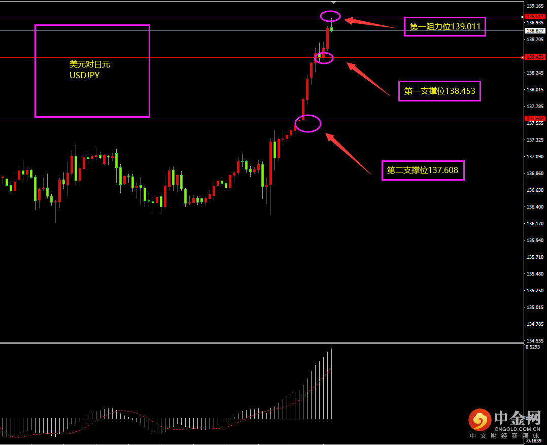 天图美日收阳线,价格有所冲高,多头有所增强,短期MACD位于0轴之上,多头占优,且近期调整力度较弱,空头不强,日内更多以逢低看多为主。小时图美日期间期间连续阳线冲高,MACD位于0轴之上,多头占优,短期上方无大阴线回落,空头较弱,日内更多以震荡以及震荡上行为主。