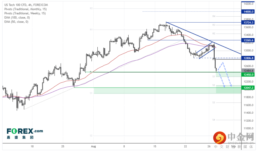 上周五美股动能急剧调头向下,价格形成看跌吞噬K线。纳斯达克100指数当周高开低收,而8月只剩三个交易日。按目前价位看,月图有望形成看跌锤子K线。