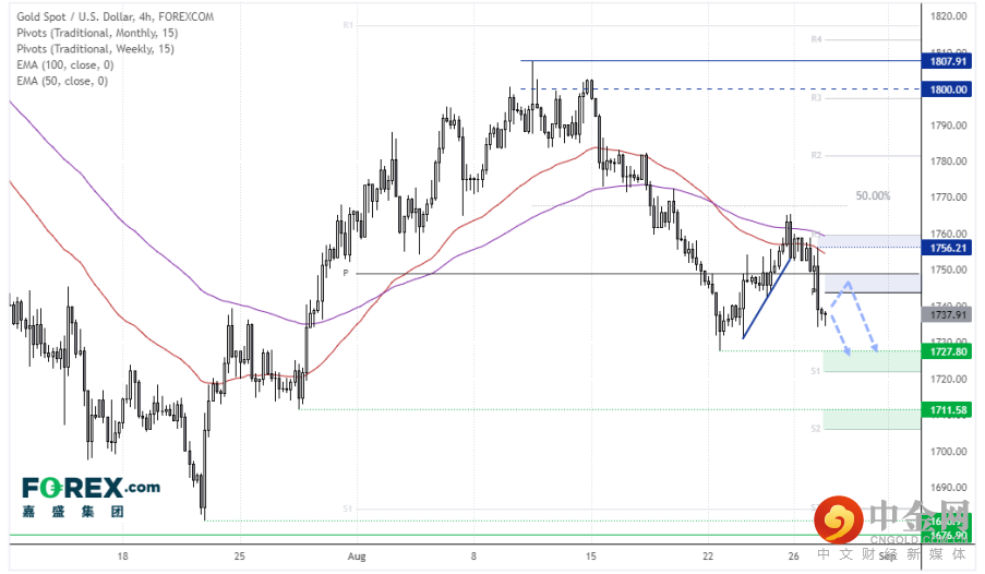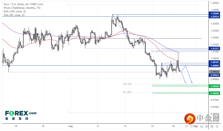 4小时图显示价格形成看跌吞噬兼看跌外包K线,业已下破趋势支撑并蓄势突破7月低点0.9992。受制于平价阻力区域继续看跌,目标先后指向138.2% 和 161.8%投射位。