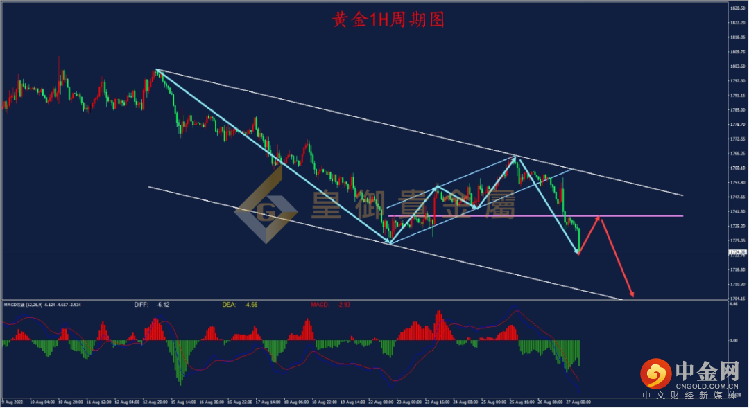 黄金上周五在鲍威尔讲话的打压下大幅下跌,早间延续下跌走势。从1H周期走势结构看,黄金上周五在跌破短期支撑线后,快速下跌,早间跌破前期低点1728.0附近支撑,表明多头上涨行情已经结束,后市大概率延续下跌,操作上可关注空单机会。结合MACD指标来看, DIFF线与DEA线死叉向下,处于零轴下方,表明空头力量偏强,日内关注黄金反弹做空机会,上方压力关注1739.0附近。