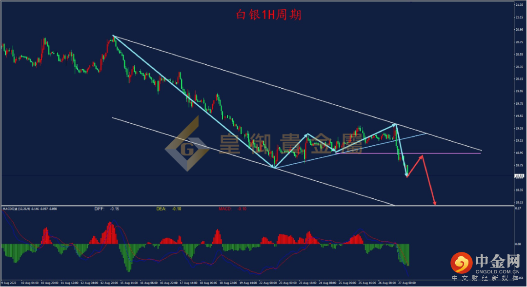 白银上周五在鲍威尔讲话的打压下大幅下跌,早间延续下跌走势。从1H周期走势结构看,白银上周五在跌破短期支撑线后,快速下跌,早间跌破前期低点18.70附近支撑,表明多头上涨行情已经结束,后市大概率延续下跌,操作上可关注空单机会。结合MACD指标来看, DIFF线与DEA线死叉向下,处于零轴下方,表明空头力量偏强,日内关注白银反弹做空机会,上方压力关注18.95附近。