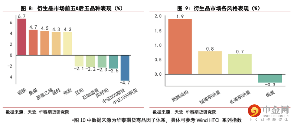 衍生品市场品种方面,本周硅铁表现最好,上涨6.7%;中证1000期货表现最差,下跌4.7%。衍生品市场风格方面,期限结构风格表现最好,上涨1.87%;偏度风格表现最差,下跌0.27%。
