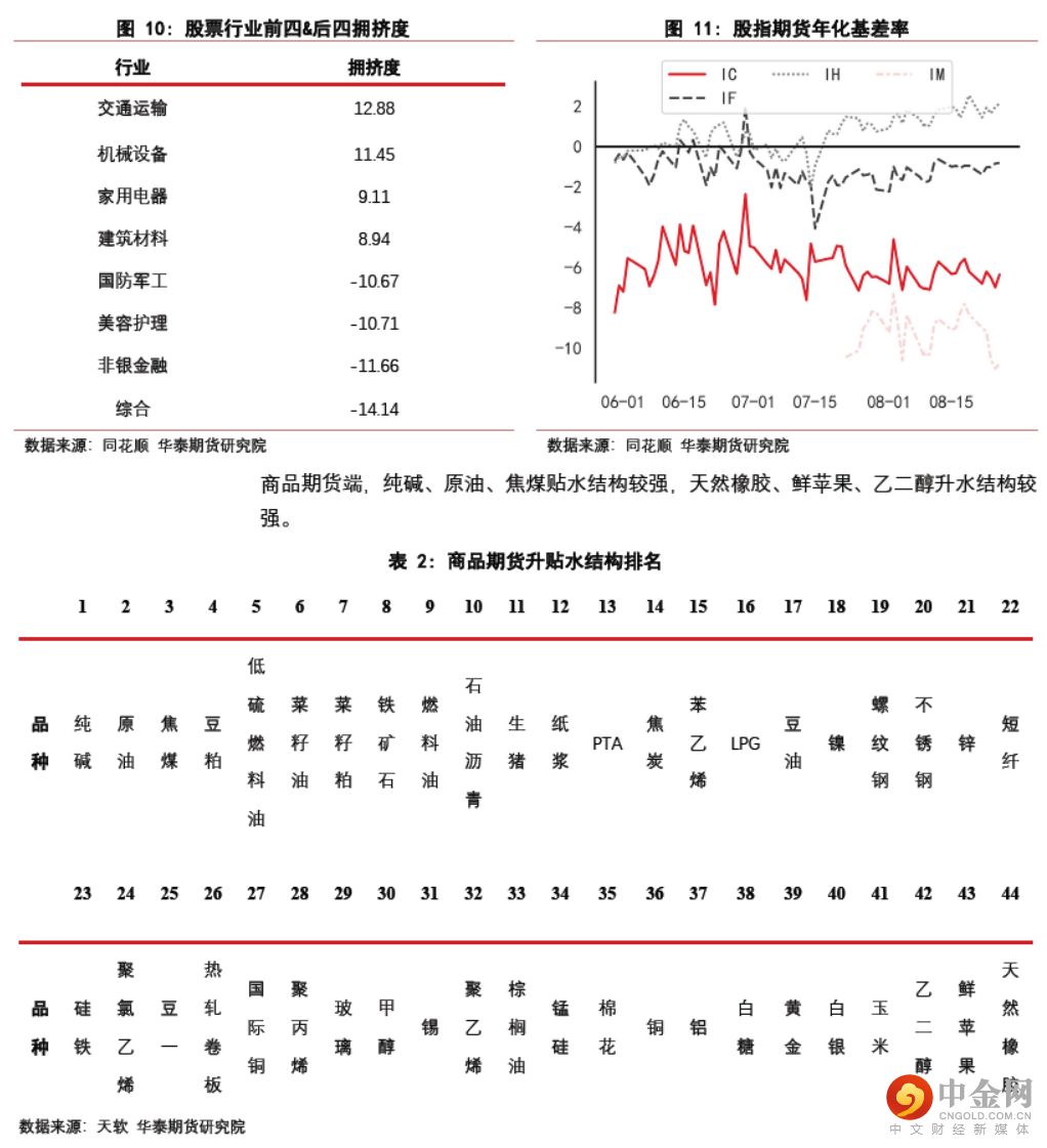 商品期货端,纯碱、原油、焦煤贴水结构较强,天然橡胶、鲜苹果、乙二醇升水结构较强。