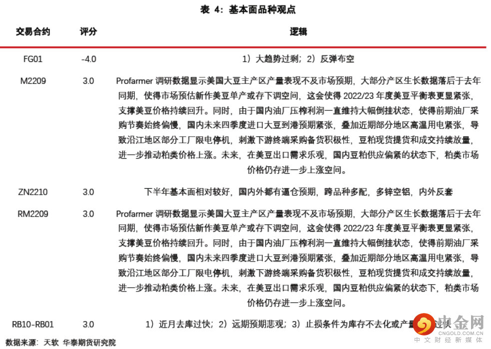 基本面角度建议做多RB10-RB01、M2209、RM2209,做空FG01、RB01-HC01。