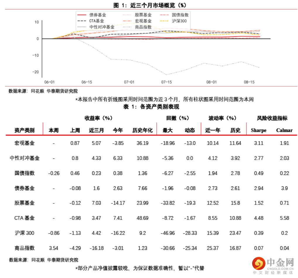 行情表现方面,本周(2022/08/22-2022/08/26)沪深300指数下跌0.86%,商品指数上涨3.54%,国债指数下跌0.26%。上周(2022/08/15-2022/08/19)各类型策略产品中,宏观基金表现最好,上涨0.87%;CTA基金表现最差,下跌0.98%。其中,债券基金跑输国债指数,CTA跑赢商品指数,股票基金跑赢沪深300,中性对冲基金跑赢现金,宏观基金跑赢现金。