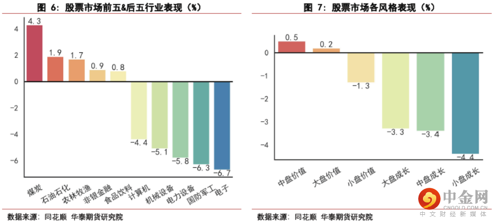 权益市场行业方面,本周煤炭行业表现最好,上涨4.3%;电子行业表现最差,下跌6.7%。权益市场风格方面,中盘价值风格表现最好,上涨0.5%;小盘成长风格表现最差,上涨4.4%。