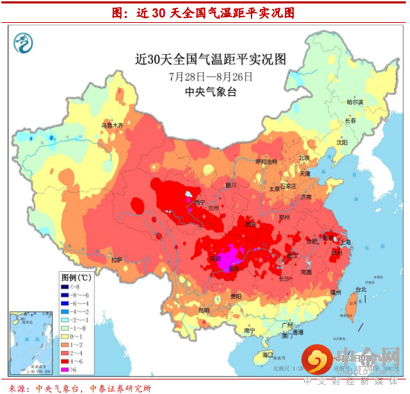 本轮区域性高温综合强度已达60年来最强。受到副热带高压和伊朗高压的影响,今年我国遇到61年来最严重热浪。根据国家气候中心监测的评估,我国6月中旬以来的区域性高温事件综合强度已达1961年有完整气象观测记录以来的最强。一方面,40℃以上气象站覆盖范围为历史最大。从近30天全国最高气温实况图上看,长江流域各省最高气温普遍超40度,整个中东部地区最高气温在37度以上。另一方面,全国平均高温日数12天,较常年同期偏多5.1天。此外,全国大部分地区气温距历史上同期平均水平高2度以上,四川、重庆局地高6度以上。