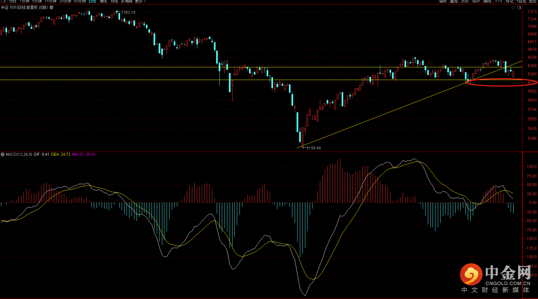 中证500短期有出现三十分钟底背驰结构,大概率会再次回到前期中枢下沿附近(6350到6380)届时会有再次回落的风险出现,注意观察日线macd量柱的变化在没有出现明显的连续收敛之前大概率还会延续调整态势。