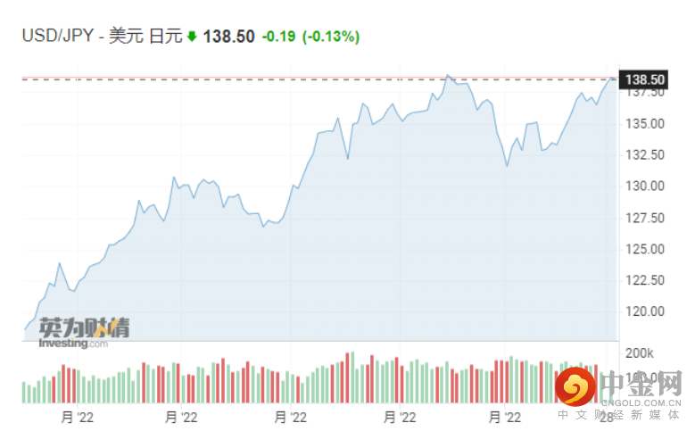 截止发稿,美元兑日元在138.50附近交投,距离日元的24年来的新低140只有一线之遥,而140关口被部分市场观察人士视为一道关键心理位。