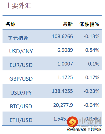 美元指数创下20年新高,受助于美联储主席鲍威尔的鹰派发言,但涨势受限,盘尾从高位回落,因欧洲央行加息预期增强提振欧元。欧元兑美元盘尾上涨0.29%,报0.9993美元,仍处于平价之下。1920 GMT,美元指数下跌0.348%,报108.8,主要受欧元上涨推动。美元兑日圆上涨0.78%,报138.76日圆。英镑兑美元盘中一度触及两年半最低的1.1649美元,盘尾下跌0.23%,报1.1703美元。