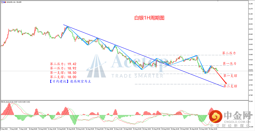 从白银1小时周期图看,白银自20.85一线进行下跌,走出高低点逐渐下移的下跌趋势并构建下跌趋势线。近日,白银在触及18.68一线后迎来反弹调整,并上破此前下跌趋势线。当前从形态上来看,白银再次向下突破震荡区间,且低点不断下移。从指标上来看,MACD指标的DIFF与DEA双线于0轴下方形成二次死叉,预计行情后市大概率将延续此前下跌趋势。日内操作建议以逢高做空为主,可于上方关键压力18.92附近进行入场。