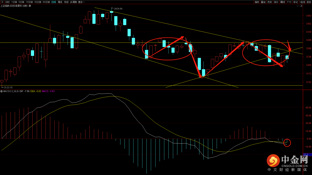 大盘早盘试探二十天线无果后出现再次回落,短期注意观察是否能够突破3250这个位置如果无法放量突破大概率还会有再次回落的走势,短期在没有跌破3217之前大概率还不会再次创出新低。