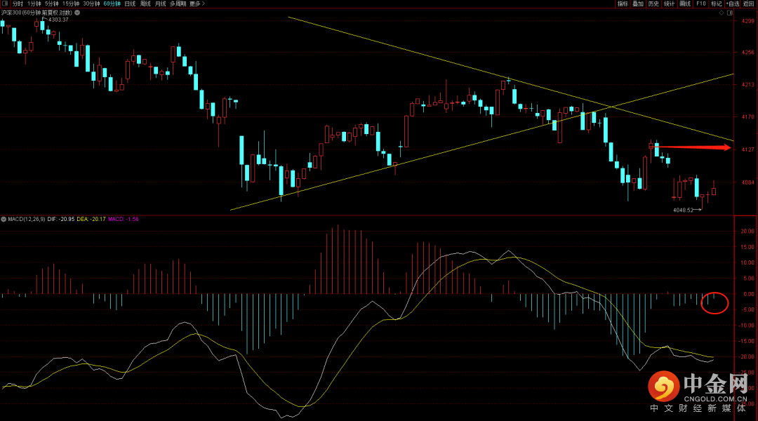 沪深300依旧维持在下降趋势中,目前已经再次新低关注六十分钟的背驰反弹段,如果无法突破4134即为弱势,届时还有再次新低的可能,而一旦能够突破有望回升到六十分钟中枢上沿4189附近。