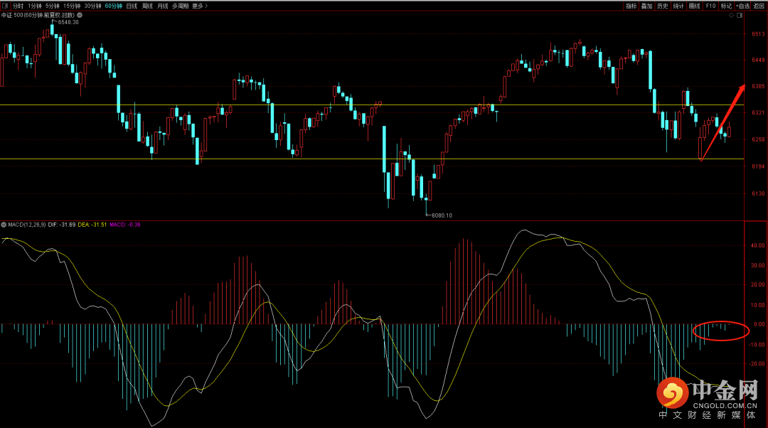 中证500回落到前期六十分钟中枢下沿后出现背驰结构,短期有望出现一段反弹走势,关注6381点压制是否能够突破,如果无法突破大概率还会有再次的向下。关注日线macd量柱的变化,在没有出现收敛之前大概率延续调整走势。
