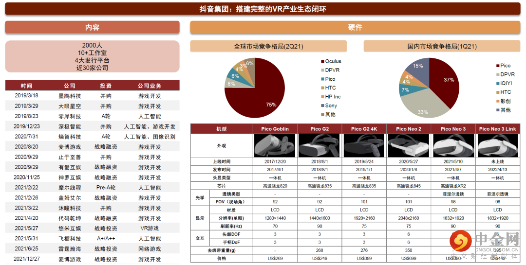 硬件方面:2021年8月,抖音集团花费50亿元收购国内领先VR硬件厂商Pico。