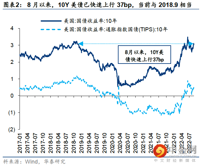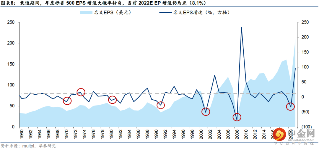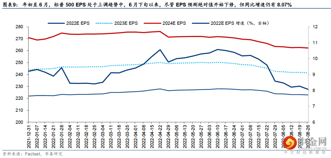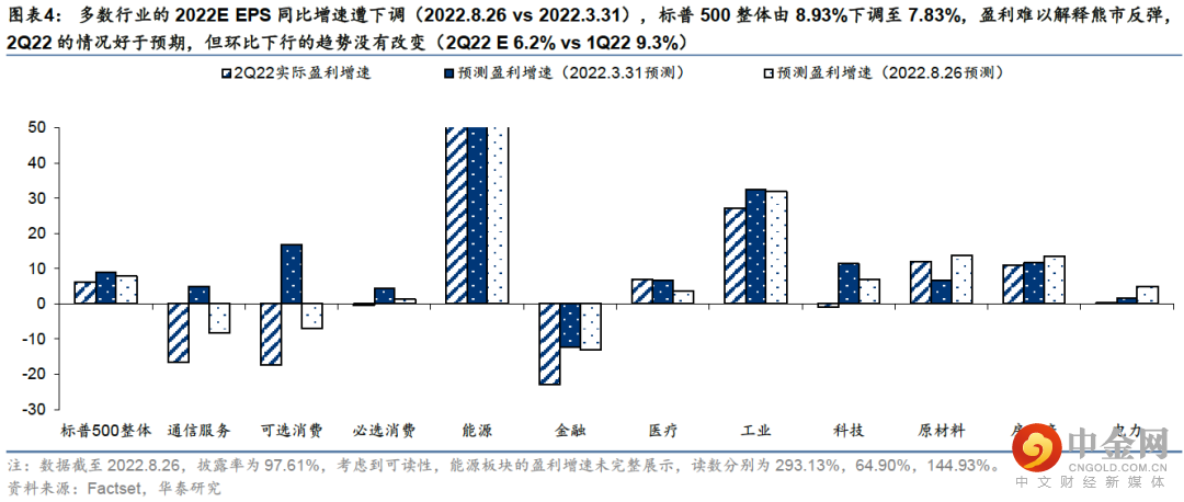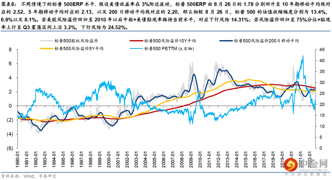 年初至6月中旬,标普500回撤达24%,期间贴现率大幅上升为估值收缩主导因素;6月中旬至8月中旬,美股迎来强力反弹,期间贴现率高位震荡,风险溢价迅速回落至“非正常”低位,与过往从滞胀走向衰退时的趋势差异较大,这也是我们前期提示美股波动率或再次回升的主要考量。当前波动率回升兑现,从两个角度思考美股下行风险:①1960年以来历次熊市+衰退环境中,美股平均最大回撤42%,当前21%;②若美股风险溢价回归至2010年后中枢+美债贴现率维持当前水平,下行风险为14%;若风险溢价回归至75%分位+贴现率上行至我们预期的Q3震荡上沿3.2%,下行风险为25%。