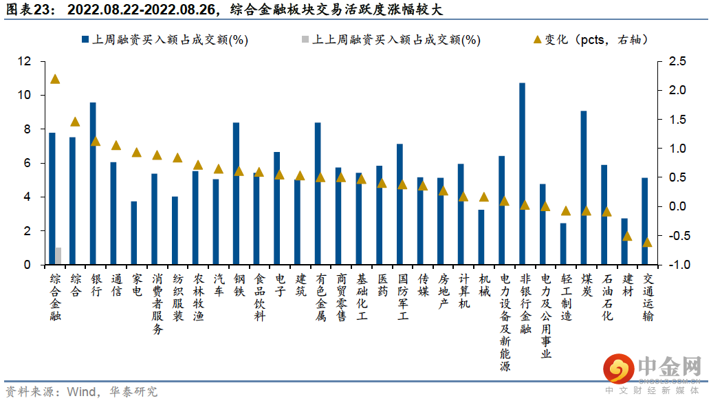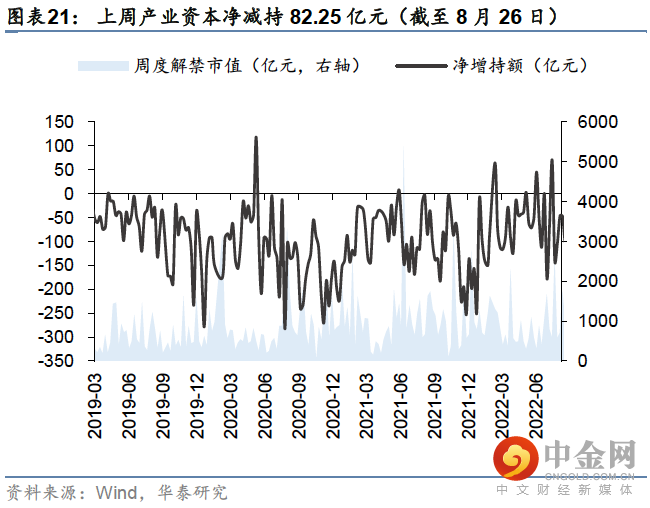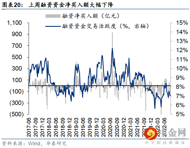 外资方面,上周北向资金净流入-46.96亿元,主要净流入基础化工(+34.26亿)、食品饮料(+13.17亿)、农林牧渔(+9.22亿)、传媒(+7.04亿)、建筑(+6.85亿),主要净流出计算机(-22.24亿)、电子(-19.6亿)、医药(-15.33亿)、银行(-11.75亿)、煤炭(-11.39亿元);公募方面上周新成立偏股型基金105.56亿份,较前一周(104.70亿份)有所上升;杠杆资金方面上周融资成交占两市总成交比重为5.71%,较前一周有所下降(7.33%),融资净买入额-44.80亿元,较前一周大幅度下降(84.40亿),分行业来看,上周综合金融(+2.19pcts)、银行(+1.12pcts)、通信(+1.06pcts)、家电(+0.93pcts)、消费者服务(+0.88pcts)板块的融资交易活跃度升幅较高,交通运输(-0.61pcts)、建材(-0.51pcts)融资交易活跃度升幅较低;产业资本方面,上周产业资本净减持82.25亿元,较前一周净减持减少(101.41亿)。