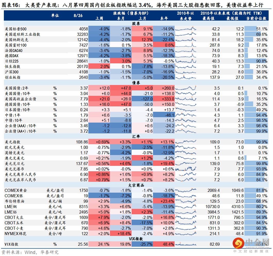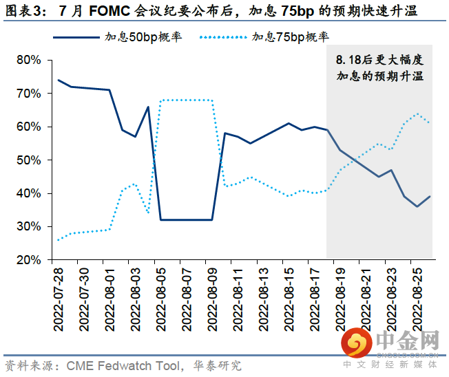 上周五杰克逊霍尔央行年会,鲍威尔鹰派发言后美股大跌,三大指数单日跌幅破3%,长久期资产跌幅更甚,纳斯达克跌近4%,黄金下跌1.2%,与之对应的是,美债长端收益率+联邦利率期货9月加息75BP概率仅小幅上升,反映对联储鹰派表态的预期程度:美债>大宗>美股,在8月中旬FOMC会议纪要公布以来,美债长端利率及9月加息期望值已在趋势上行,美股本轮波动率的再次回升,是对前期过于乐观的流动性预期的系统性纠偏。