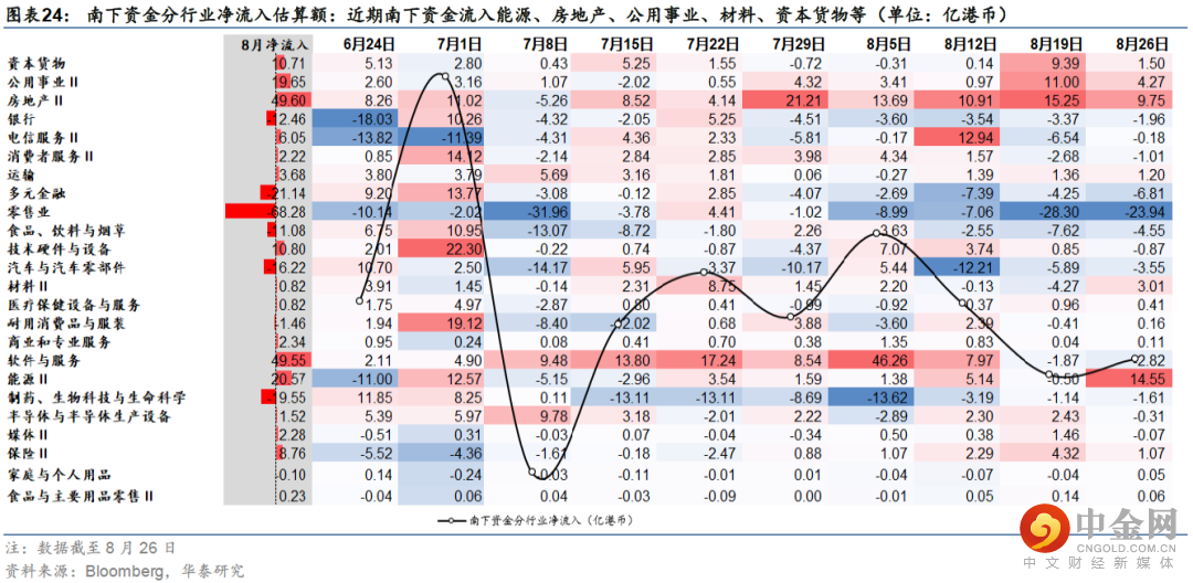 南下资金净流出11.56亿港元,相较上一周(净流出19.68亿港元)有收缩态势。从分行业南下资金的分布来看,能源(+14.55亿港元)、房地产(+9.75亿港元)、公用事业(+4.27亿港元)、材料(3.01亿港元)、资本货物(+1.50亿港元)板块净流入居前;零售业(-23.94亿港元)、多元金融(-6.81亿港元)、食品、饮料与烟草(-4.55亿港元)、汽车与汽车零部件(-3.55亿港元)等板块净流出居前。