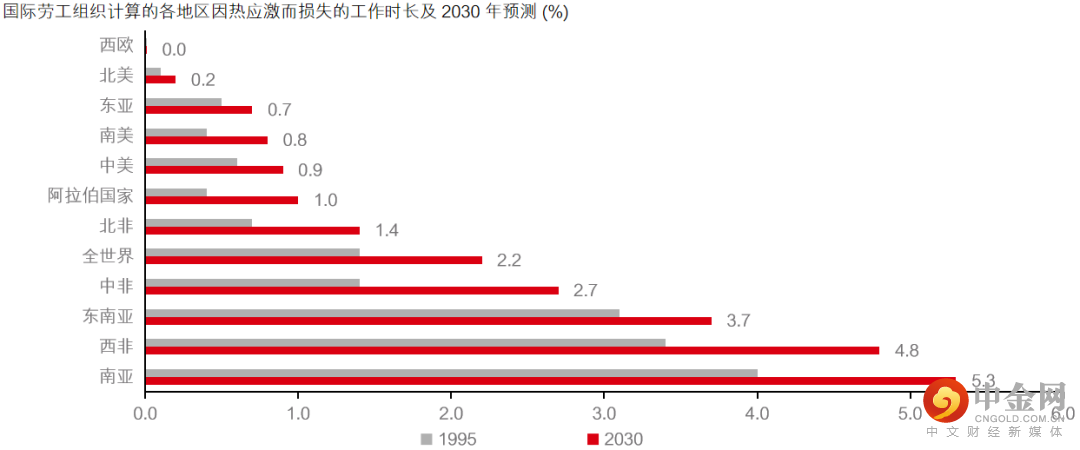 国际劳工组织估计,到 2030 年,由于热应激,全球总工作时长可能会减少 2% 以上(或相当)。7 这相当于累计 2.4 万亿美元的财务损失。
