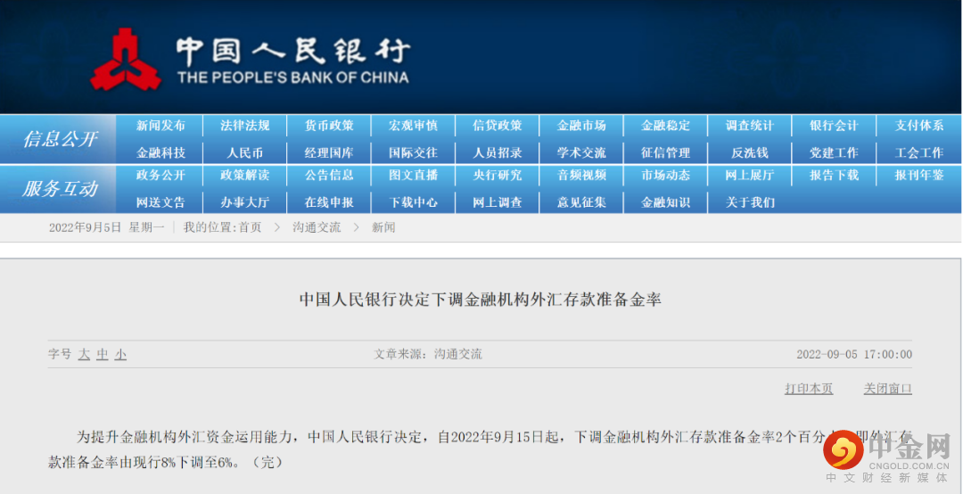 昨日晚间,中国人民银行网站发布消息,为提升金融机构外汇资金运用能力,中国人民银行决定,自2022年9月15日起,下调金融机构外汇存款准备金率2个百分点,即外汇存款准备金率由现行8%下调至6%。