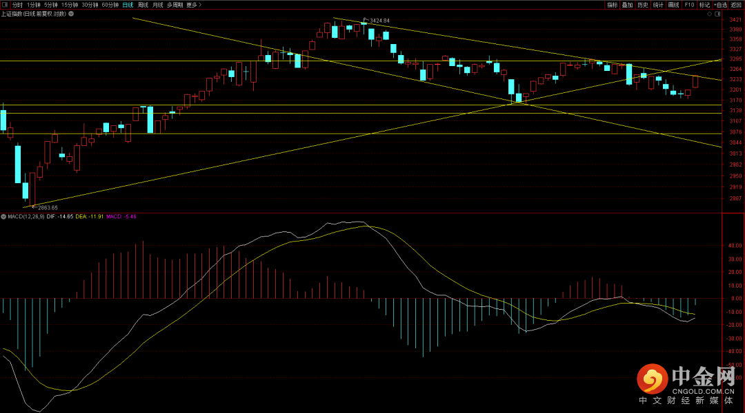 大盘跳空高开后向上反弹,短期已经来到了二十天线与下降趋势线压制附近,注意观察量能的变化,如果未来三天不能出现持续放量的状态,可能会再次回落回补跳空缺口。而上方需要关注的是否能够突破3308,如果出现突破则有构筑双底的可能将有希望回补前期3405附近的缺口。