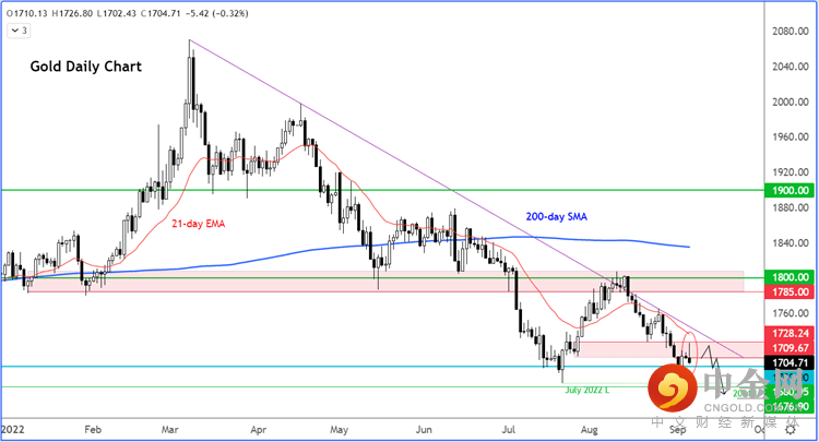 黄金未能守住早前涨幅,现在几乎可以确定会大举向下突破。对全球经济衰退的担忧继续提振美元买需,即使美元处于如此高位都没有改变需求。投资者越来越相信,美联储本月将再加息75个基点并且今后进一步积极加息,直到完成控通胀任务。