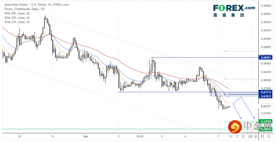 澳元/美元跌至8周低点,符合我们的看跌预期。30分钟图交投于下降通道内,也交投于昨天低点附近的狭窄盘整区间内。如果在重拾趋势前回调,我们不会感到意外。如果回调,我们会寻找在均线或0.6761/71阻力区域附近的看跌结构。价格趋于最终下探0.6700支撑区域。