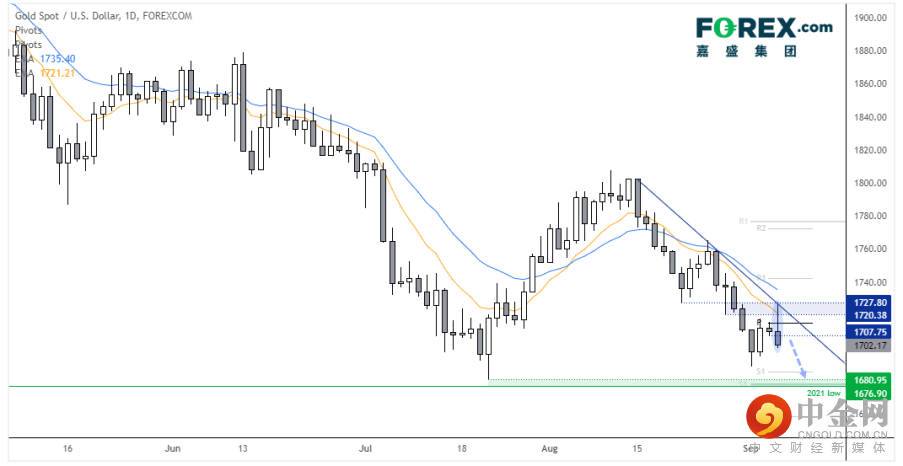 我们怀疑黄金已完成回调进度,现准备展开新一轮跌势。金价形成了外包阴线,也是一根锤子大阴线。锤子阴线的高点没有突破趋势线阻力兼10天指数移动均线,价格目前守在1700上方不远处。如果下破该位,价格可能延续下跌,目标1680支撑区域。不过,如果价格带着低波动性朝周图中枢点位回调的话,我们也考虑逢高沽出,目标1700下方。