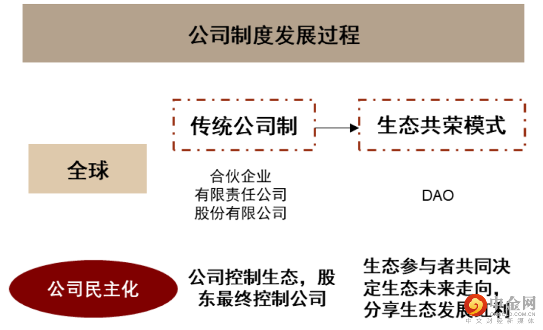 类比过去300年国家政体民主化进程,以DAO为载体的生态共荣模型可以视为新的民主化公司制度。
