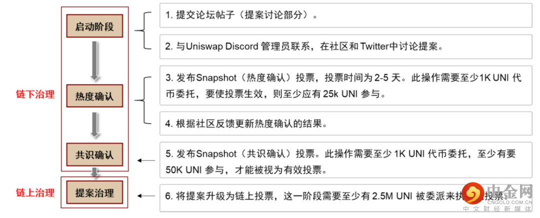 而Uniswap的治理环节的决策流程可以分为三步:热度确认、共识确认、提案治理。